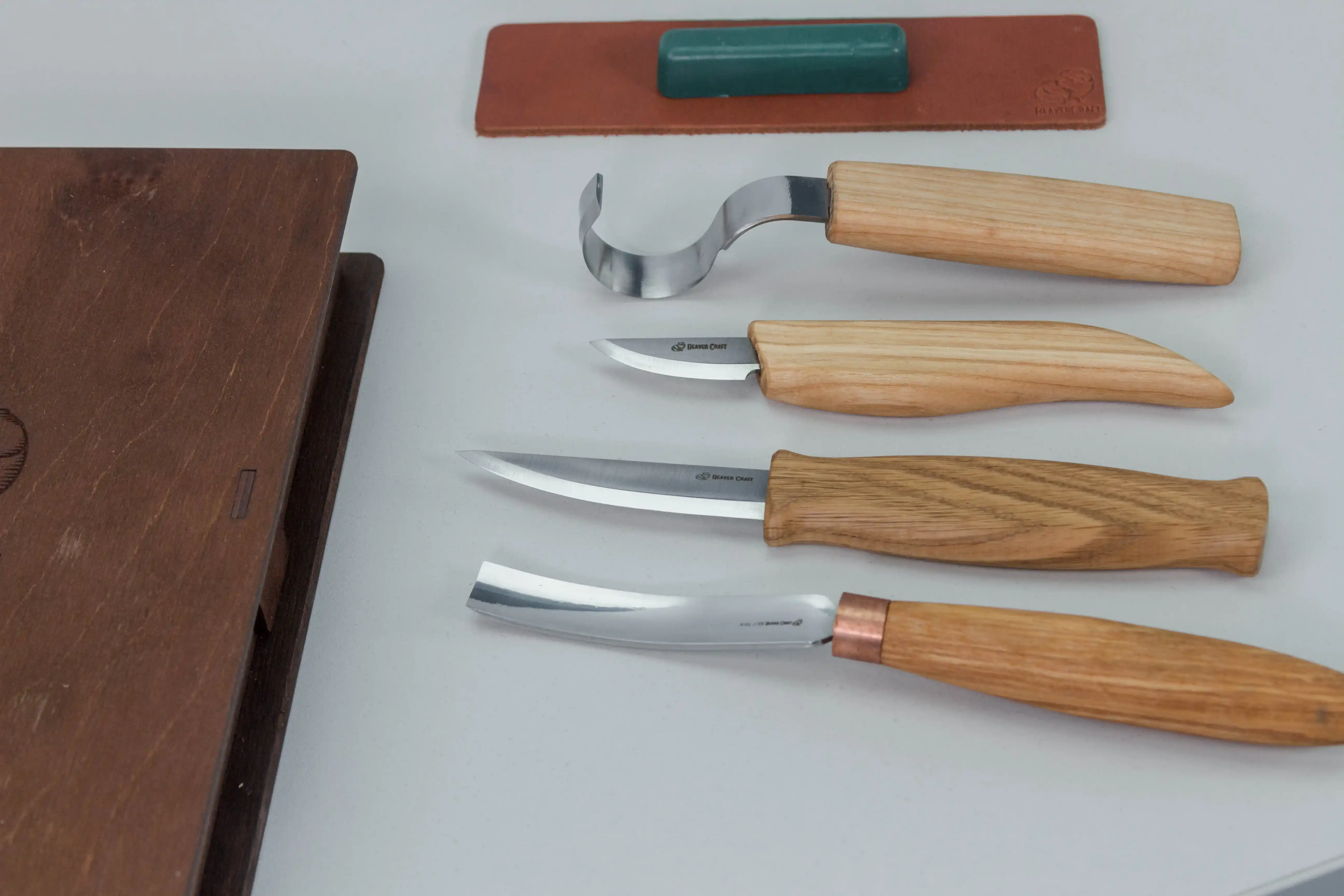 Juego profesional para tallar cucharas y kuksas, que incluye cuchillo sloyd, cuchillo corto, cuchillo de gancho y cincel redondo largo y curvado. Con accesorios de afilado.