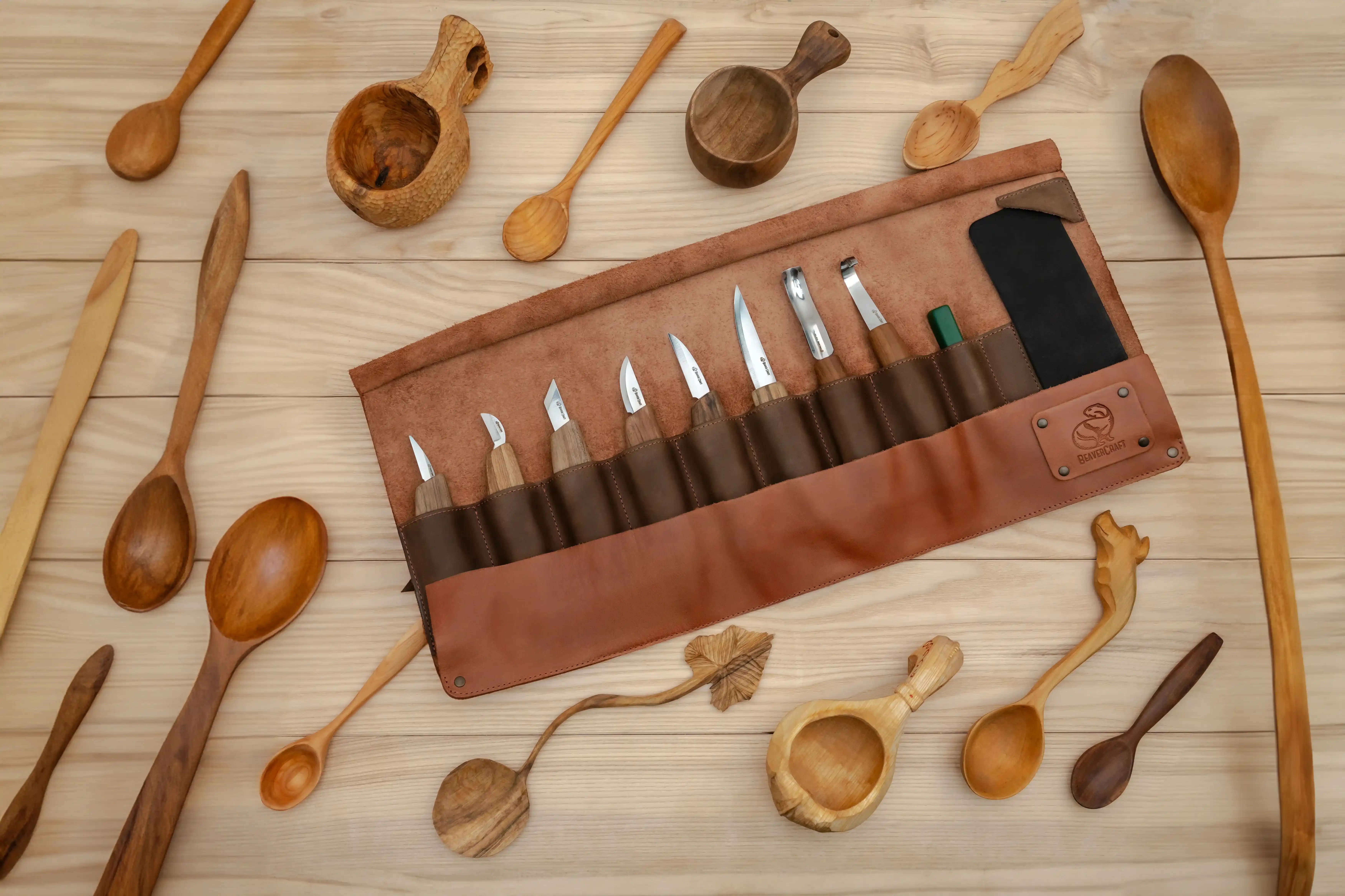 Juego de cuchillos multiusos de gran tamaño con mangos de nogal. Presentado en un elegante estuche de cuero auténtico e incluye accesorios de afilado de alta calidad.