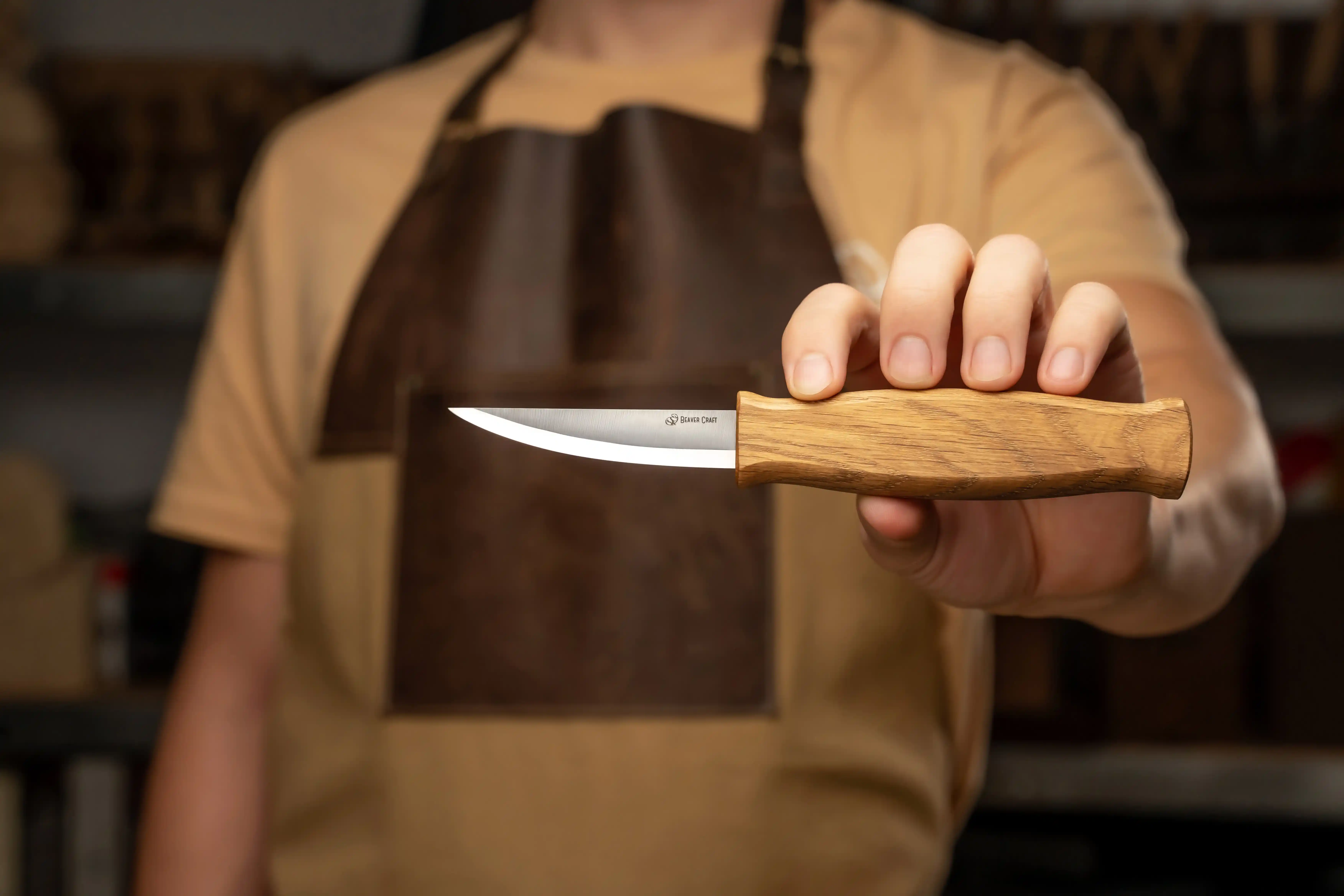 Esta faca de entalhe Sloyd é uma ferramenta fiável para trabalhos em madeira e escultura. A sua lâmina longa e estreita possui um dorso reto e um fio curvo e afiado, ideal para desbaste, modelação e trabalhos de detalhe. Fabricada em aço carbono 1066, a lâmina oferece durabilidade e uma excelente retenção do fio. O cabo ergonómico em carvalho, com acabamento em óleo de linhaça natural, proporciona uma aderência confortável e segura. Esta faca inclui uma bainha leve em pele castanha para um armazenamento e transporte seguros e fáceis. Perfeita para entalhar, criar colheres, estatuetas e muito mais.