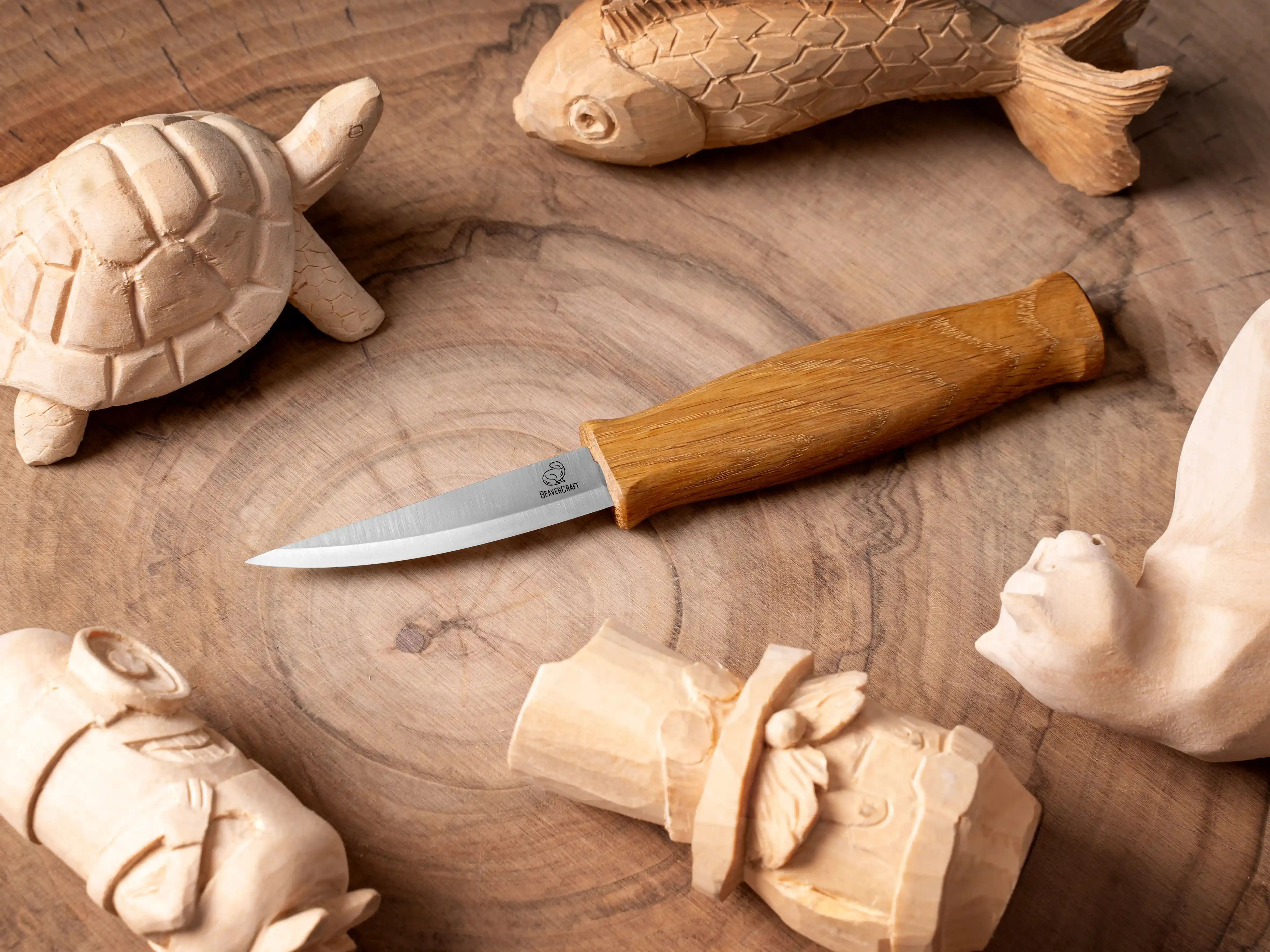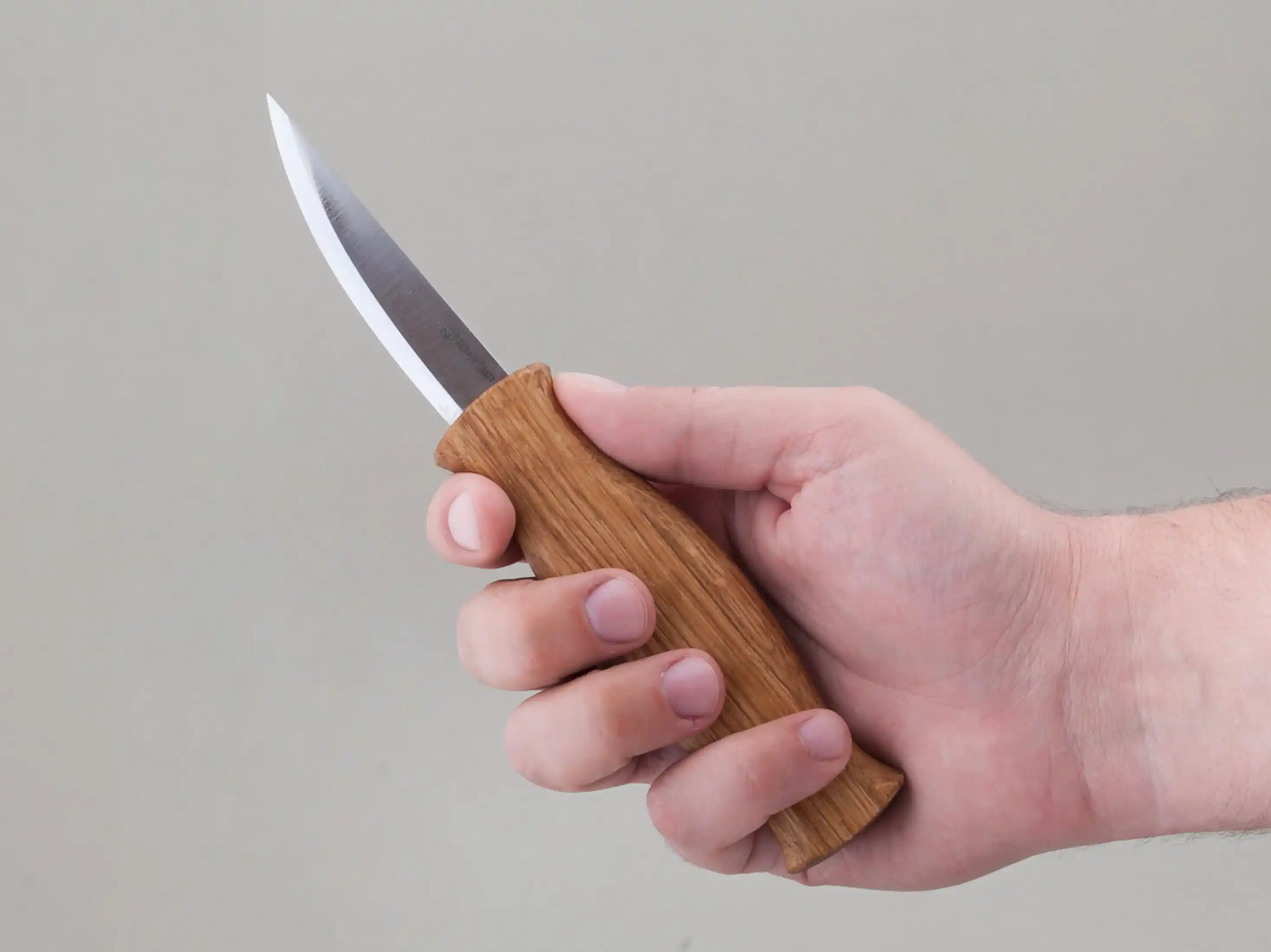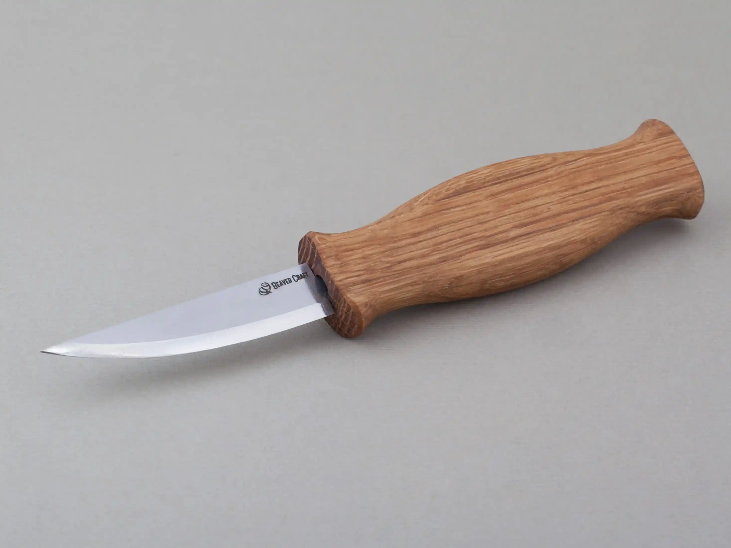 El cuchillo de tallar sloyd está diseñado para cortar y desbastar madera. Cuenta con una hoja recta para eliminar piezas más gruesas y una punta redondeada y resistente. Con este cuchillo, podrá cortar tanto madera blanda como dura. Este sloyd se puede usar para tallar cucharas, mangos, bastones, tirachinas y mucho más. El mango es de madera de roble y está recubierto con aceite de linaza natural, lo que le proporciona un tacto agradable.