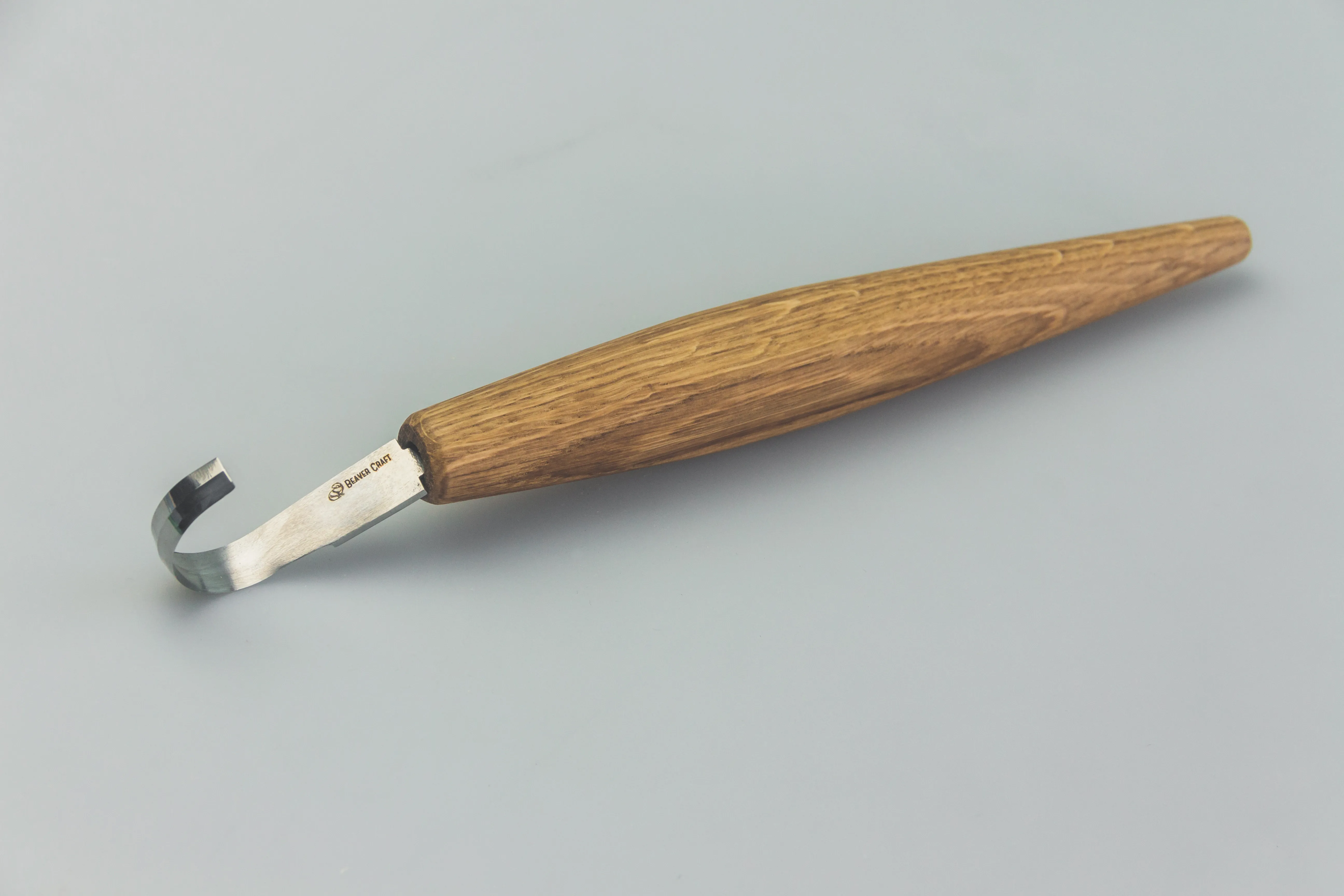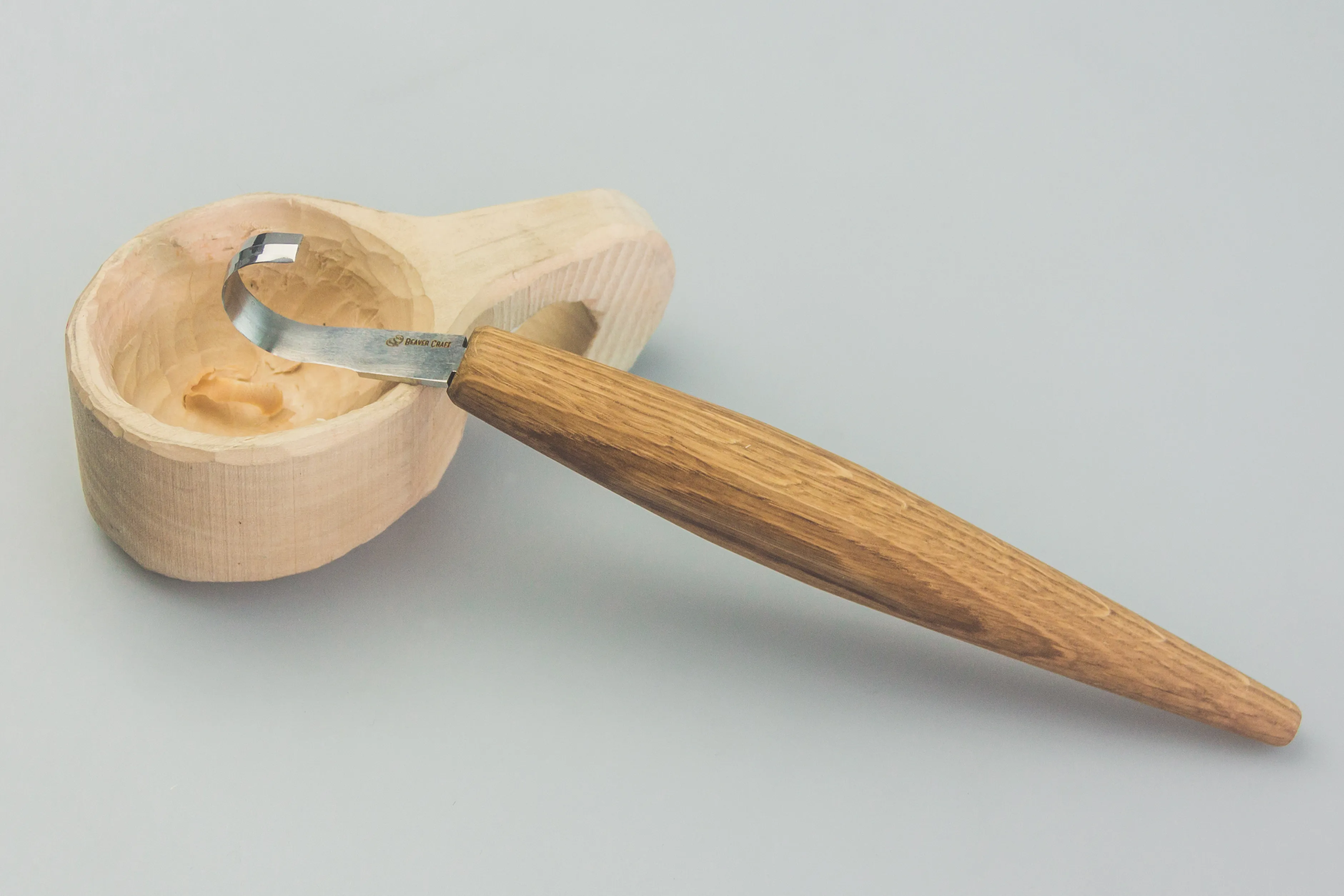 Cuchillo para tallar cucharas con biseles de corte profundo. Esta versión de mano te brindará una excelente experiencia de tallado para tus proyectos de cucharas, kuksas y cuencos. Los biseles de doble cara te permiten realizar cortes profundos y suaves con movimientos ligeros y controlados. El mango más largo te permite trabajar con una o ambas manos. La forma ergonómica del mango te permite tallar durante más tiempo sin cansarte. Esta es la versión de filo simple del cuchillo SK5 para una experiencia de tallado más cómoda. También disponible para zurdos.