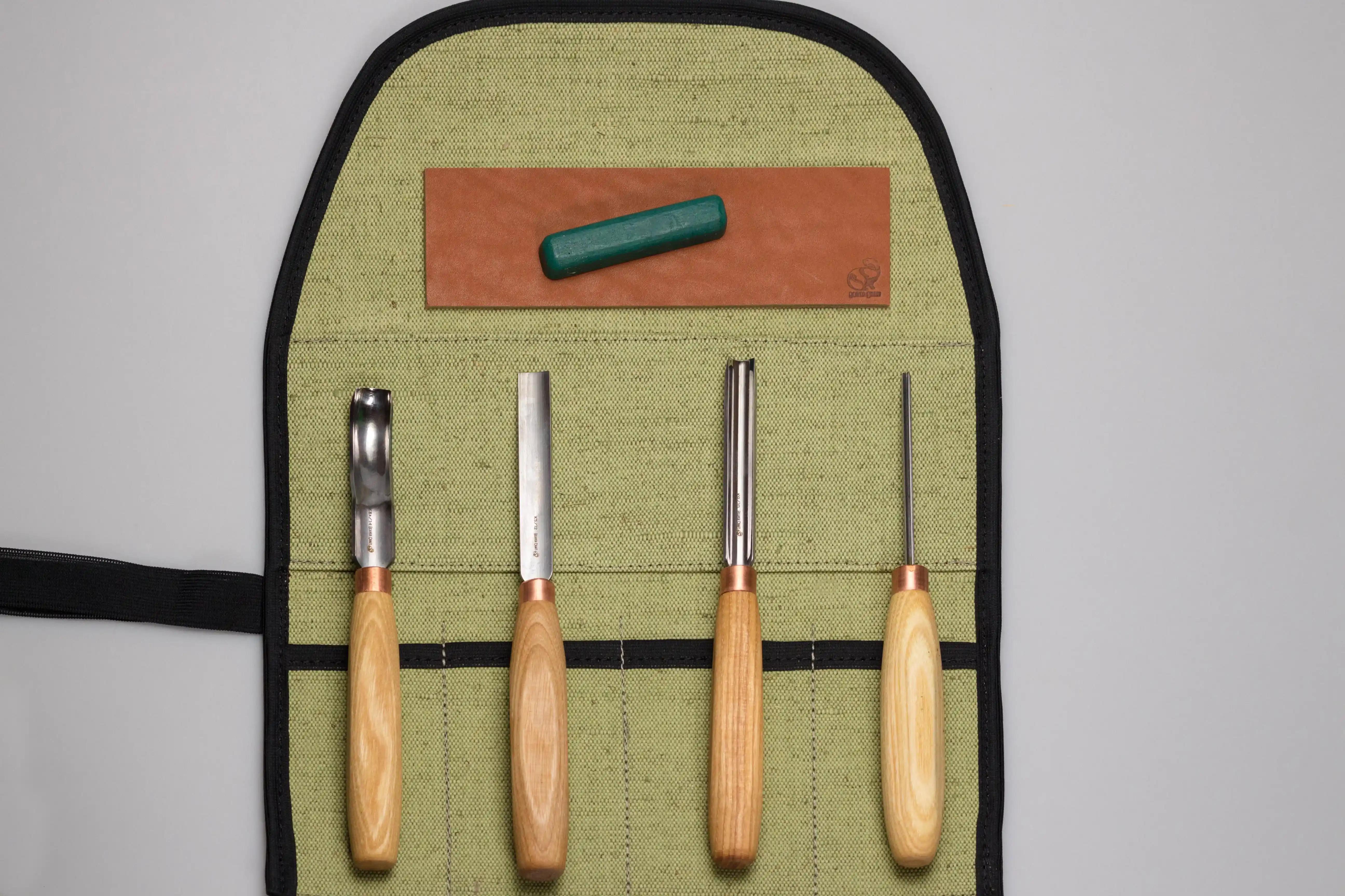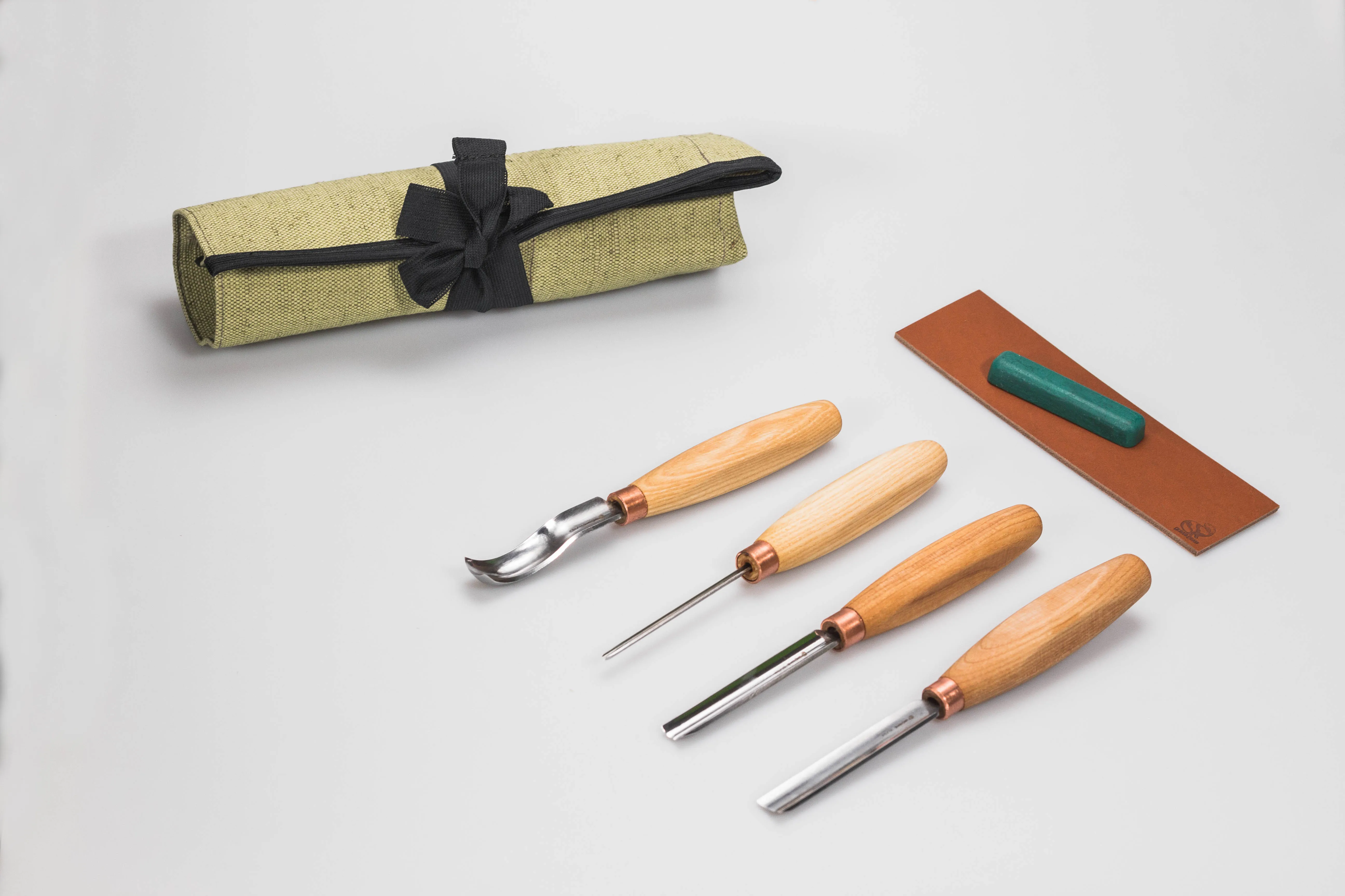 El juego incluye cinceles y una gubia curva corta, con las que podrá tallar fácilmente una cuchara, una kuksa o cualquier escultura de madera. Las herramientas sirven tanto para madera blanda como para madera dura. Las hojas están hechas de acero de alto contenido en carbono, bien afiladas y pulidas. Estos cinceles para tallar madera se utilizan exclusivamente para trabajos manuales de precisión, sin usar martillo ni mazo. Los mangos de fresno están ligeramente encerados para protegerlos, conservando su color y tacto naturales. Todas las herramientas vienen afiladas de fábrica e incluyen un estuche para facilitar su almacenamiento y transporte. El juego también incluye una correa de cuero para afilar y un compuesto para pulir, para afilar las herramientas cuando sea necesario.