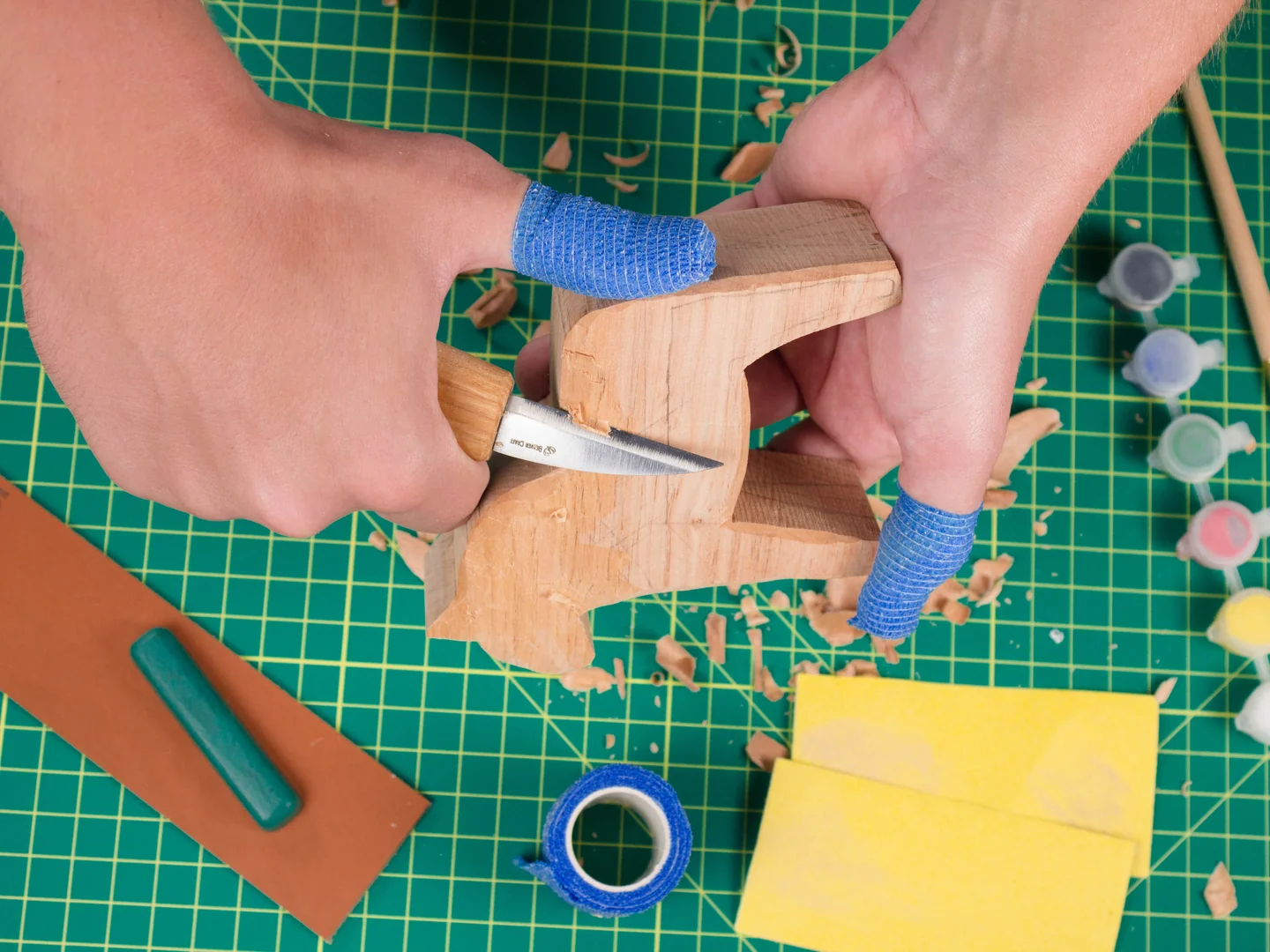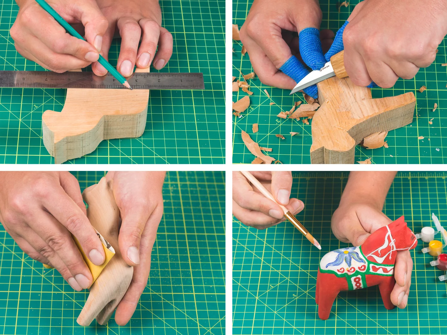 Nuestro kit todo en uno incluye todo lo necesario para esculpir un caballo dala: cuchillo de tallar C14, base de madera de tilo, lápiz, pincel y kit de pinturas, papel de lija P150 (2 unidades), asentador de cuero y compuesto para pulir, y cinta de corte resistente. Este kit de iniciación es ideal para niños, adolescentes y adultos mayores de 12 años. Está diseñado principalmente para principiantes. Cada kit de manualidades incluye un enlace a un videotutorial donde podrás ver todo el proceso paso a paso y completar con éxito tu proyecto de escultura.